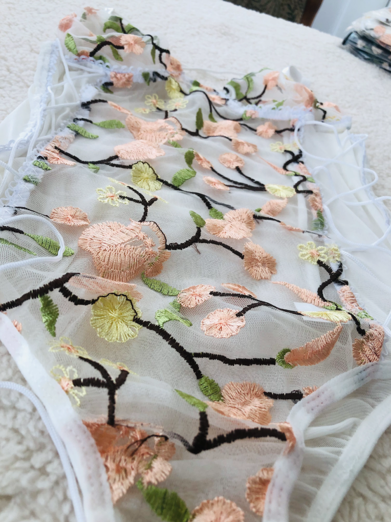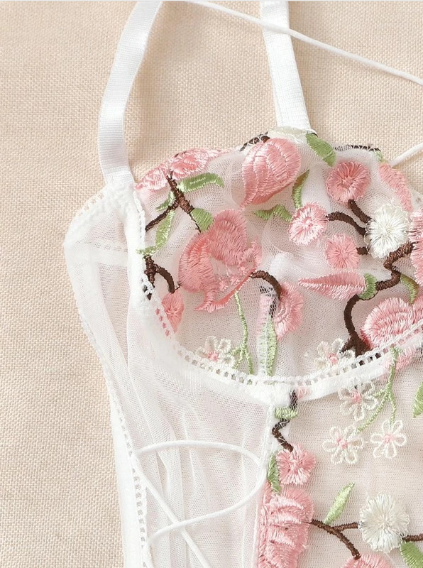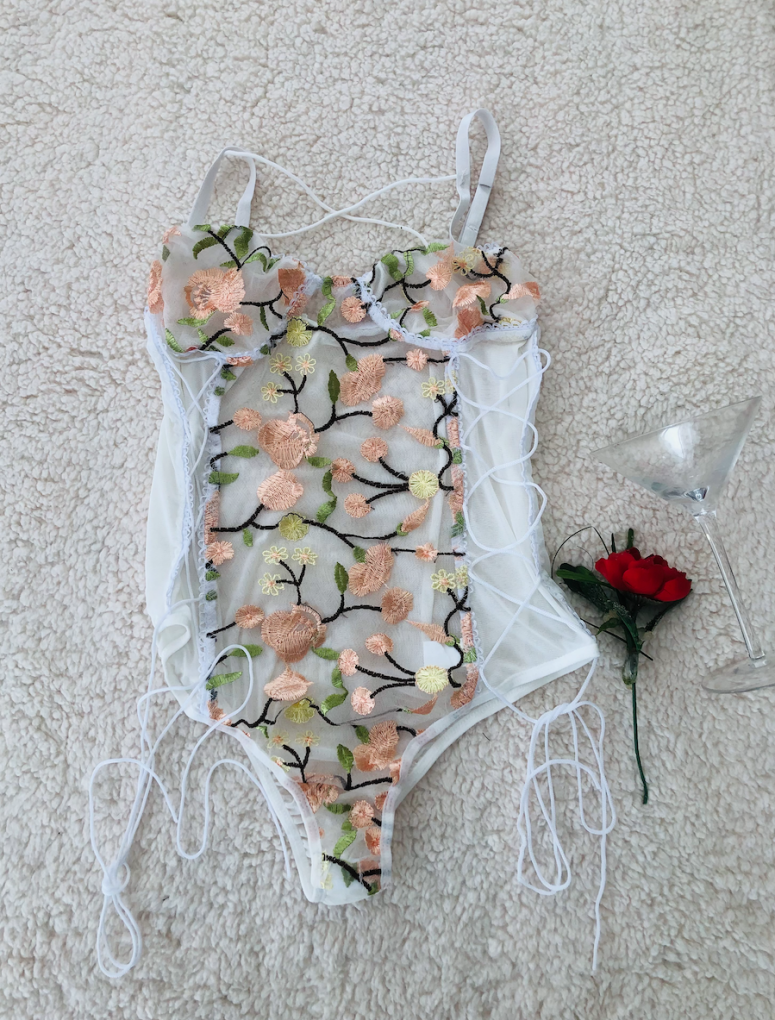 Acest body este mai mult decât un articol de lenjerie — este o emoție purtată pe piele. Culoarea albă simbolizează puritatea și eleganța, iar modelul floral adaugă o notă de rafinament subtil. Plasa transparentă lasă loc misterului, creând un echilibru perfect între inocență și pasiune.