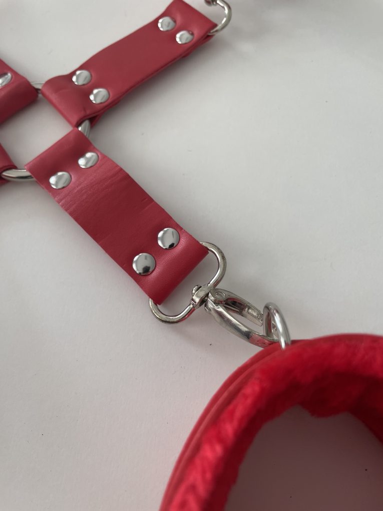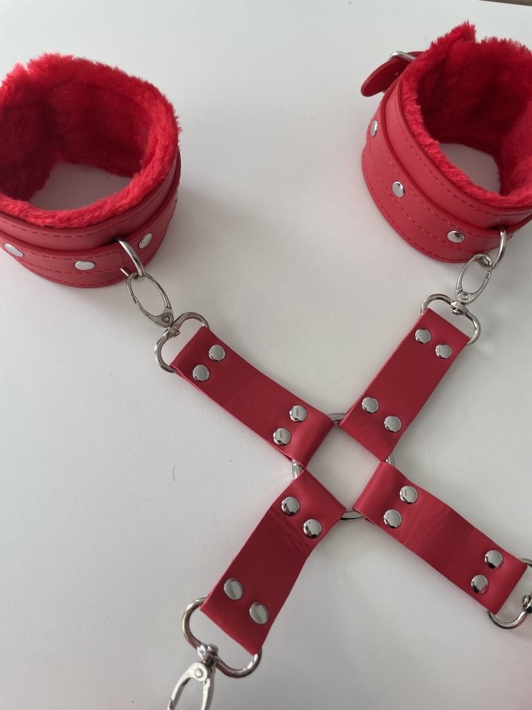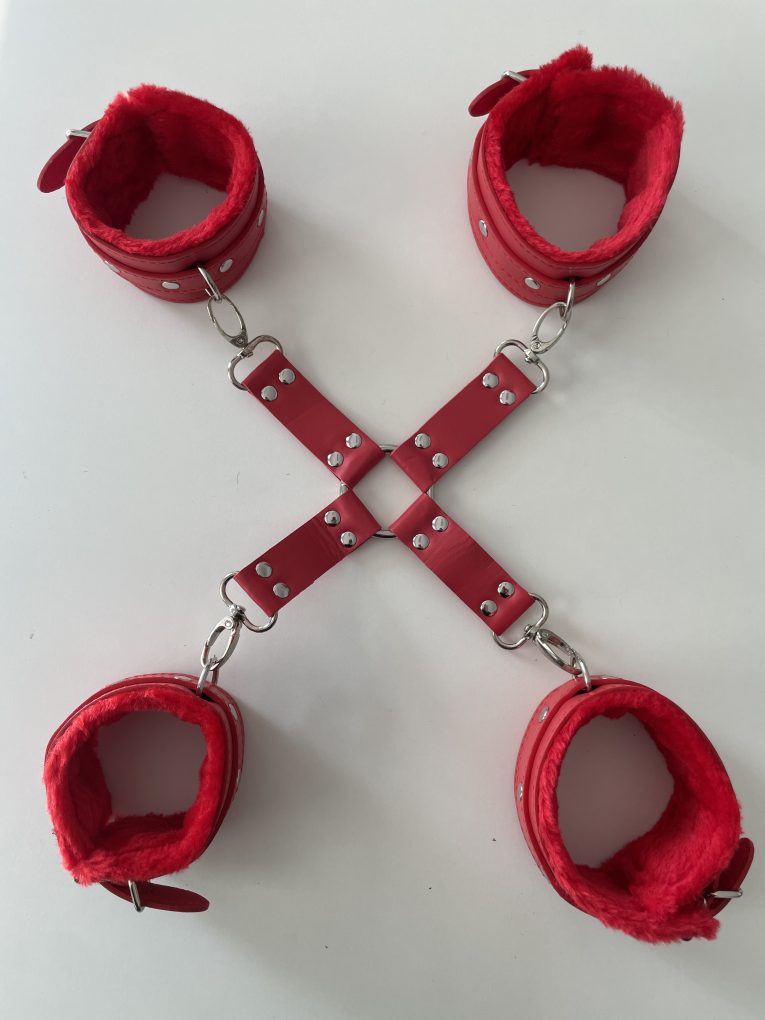 Set bondage premium roșu – cătușe pentru mâini și picioare, cod produs BK-38. Un accesoriu BDSM elegant și intens, creat pentru cuplurile care doresc să exploreze dominarea și plăcerea senzuală într-un mod sigur, confortabil și rafinat. Designul în formă de „X” oferă o poziționare stabilă, iar blănița moale asigură o experiență erotică lipsită de disconfort.